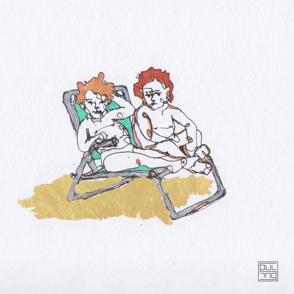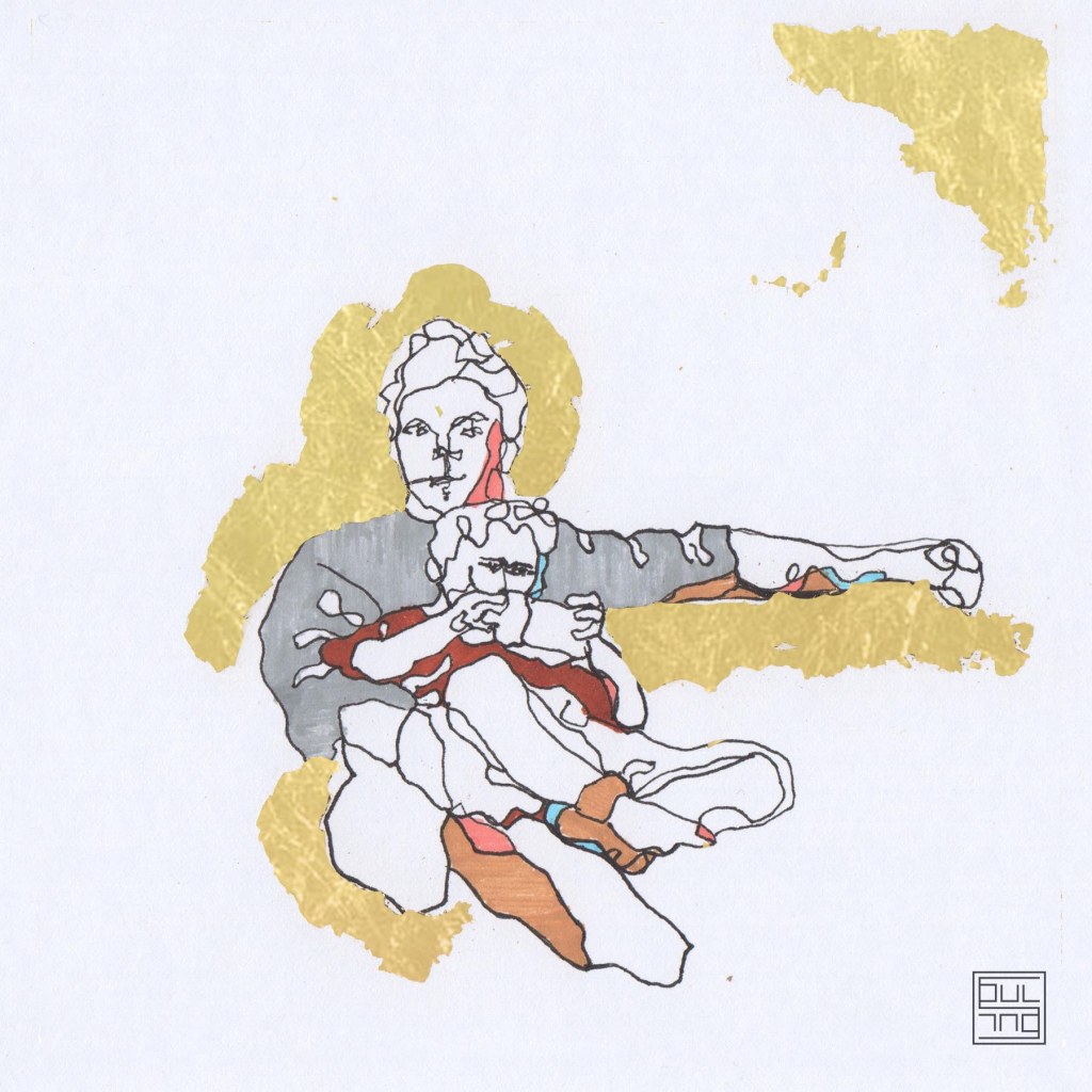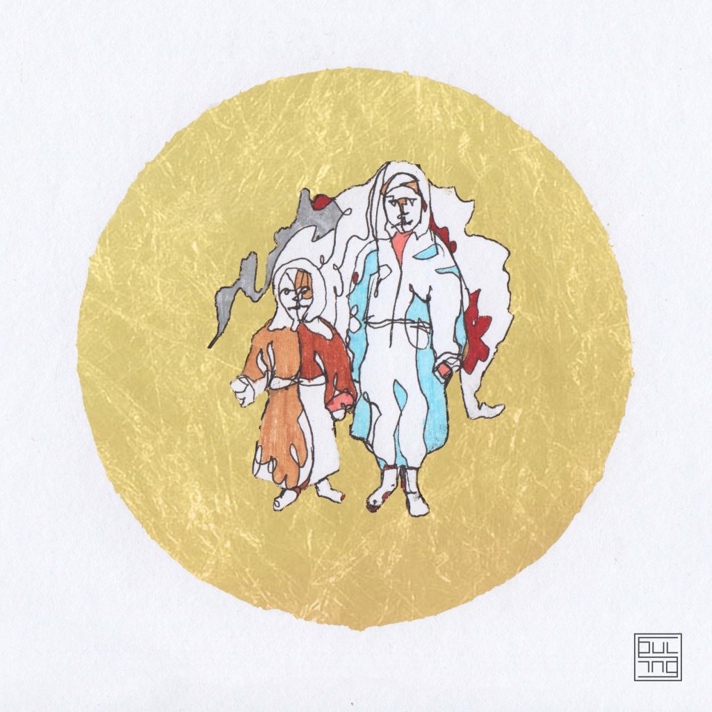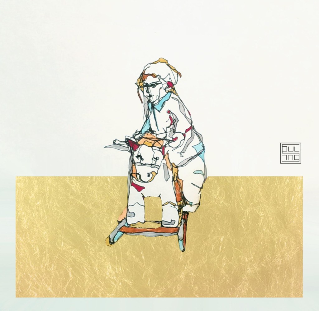 My works mainly depict child figures. It is about mixed technique, where ink and gold leaves are combined. The figures interact, perplex, and create moments. At a glimpse, the sensation of temporary recall of a memory or sentiment is created. The artworks create the feeling of nostalgia for childhood, either in a carefree way or not. However, this feeling is always created by a sequence of thoughts regardless of age.