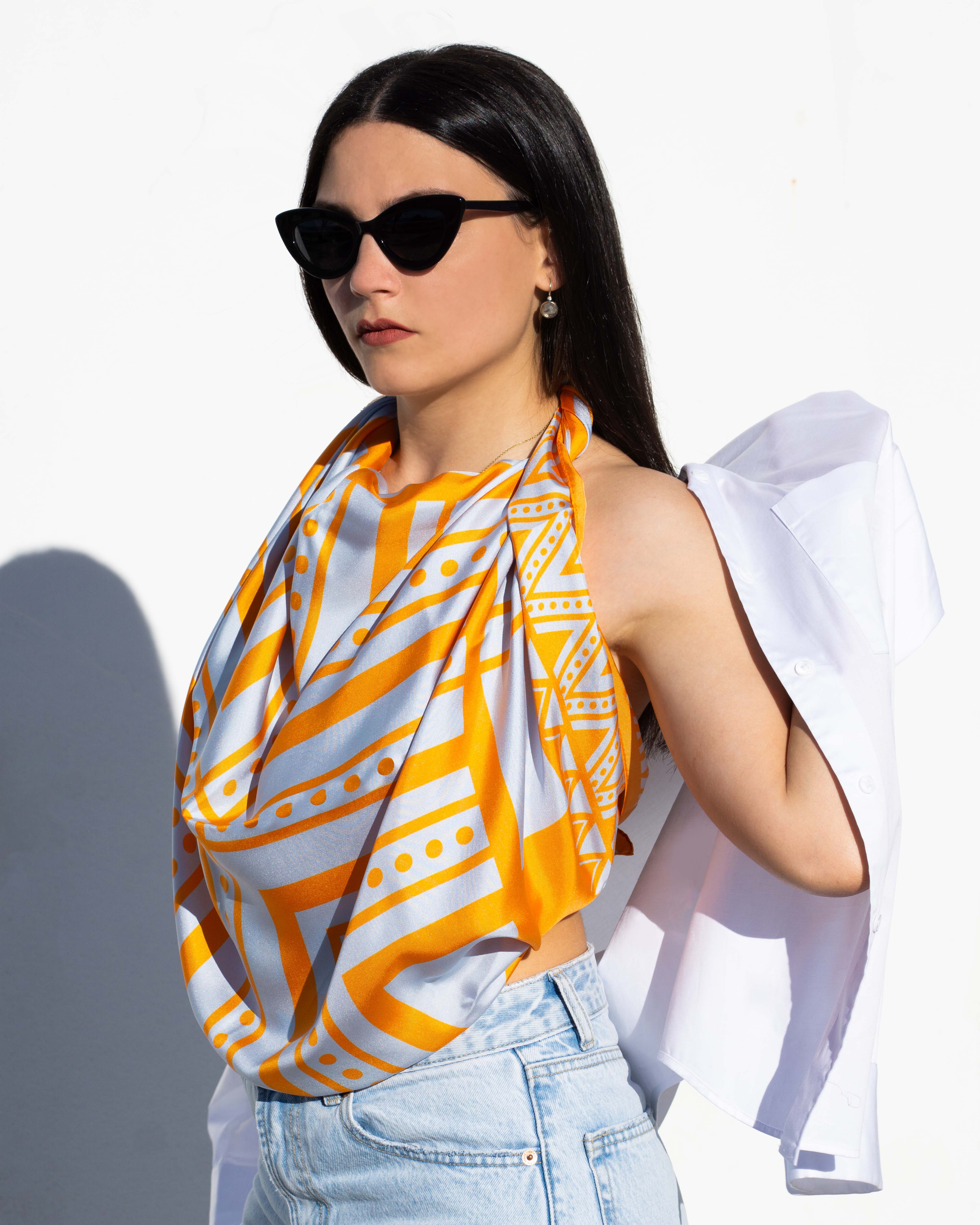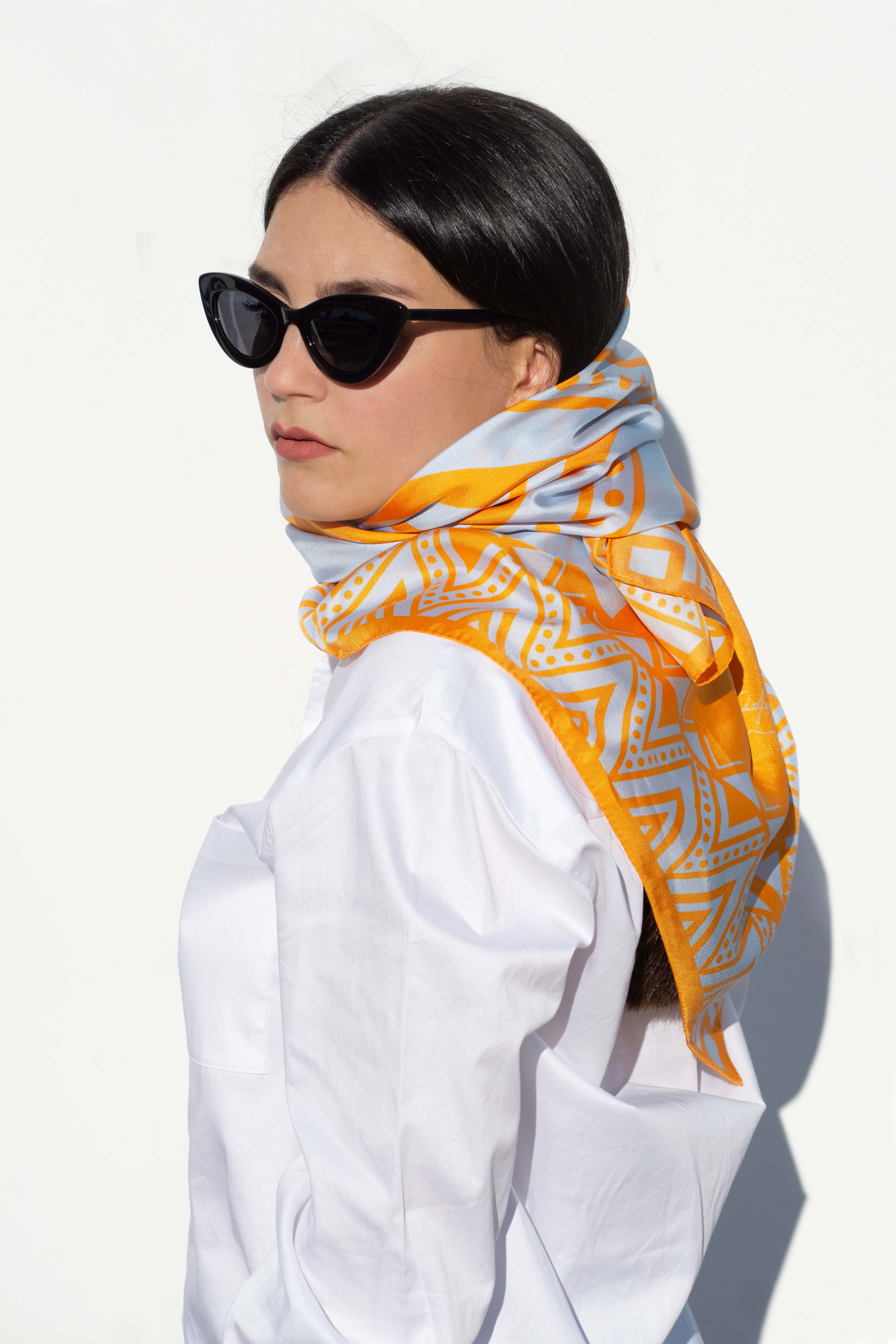 The silk scarves draw inspiration from Cycladic art motifs. Expertly crafted in Greece from 100% pure silk with a delicate twill weave for softness and durability. Each piece reflects our commitment to quality and craftsmanship.